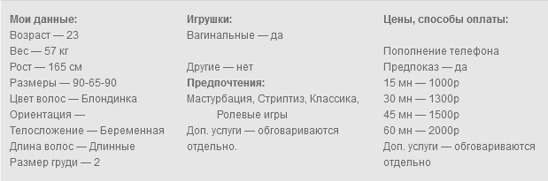 Привет мои дорогие мальчики. Я беременная и при этом страстная и очень пошлая блондинка которая с удовольствием проведет с вами время и предоставит вам свое тело и внимание. Очень люблю играть с своей попкой, ласкать твердый клитор, нежно трахать свою упругую киску. Готова вам предложить переписку без комплексов и табу, фото и видео под заказ и конечно живое онлайн общение по вебкамере где мы узнаем друг друга гораздо лучше. Я готова станцевать для тебя стриптизер который перейдет в нежные ласки и конечно закончится совместным оргазмом. Я практически все время онлайн, так как хочу доставлять тебе удовольствие в любое время. Я одна из тех немногих моделей которые не симулируют оргазм, так что вирт со мной ты обязательно запомнишь на долго. Пиши мне быстрее, и пообщаемся с тобой даже на самые пошлые темы