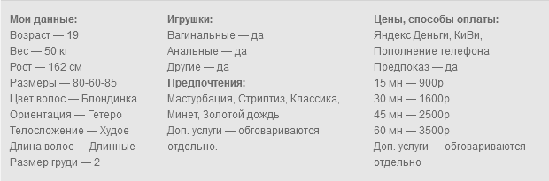 Новенькая девятнадцатилетняя очень развратная малышка. Виртик с лицом без доплаты. Всегда онлайн для тебя. Меня ну очень заводит вирт. Можешь быть уверен, я всегда шалю как в последний раз. Ты обязательно будешь просто в шоке от моей страсти и секс фантазий. В вирте со мной у тебя не будет ограничений. Офигенный анальчик, узенькая киска, рабочий ротик. В ролевых играх табу совсем нет, огромный выбор костюмов для наших секс игр и развратного белья. Любишь что-то необычное? Любишь ножки, ручки, любишь игрушки? Пиши мне, я тебя побалую всем, большой ассортимент, и много услуг, ты точно найдешь что-то под себя. Самые горячие фото и видео можно увидеть только у меня, пиши мне. Готова воплотить ваши тайные фантазии и желания ,приходи тебя ждет гарантированный железный стояк и феерический оргазм.