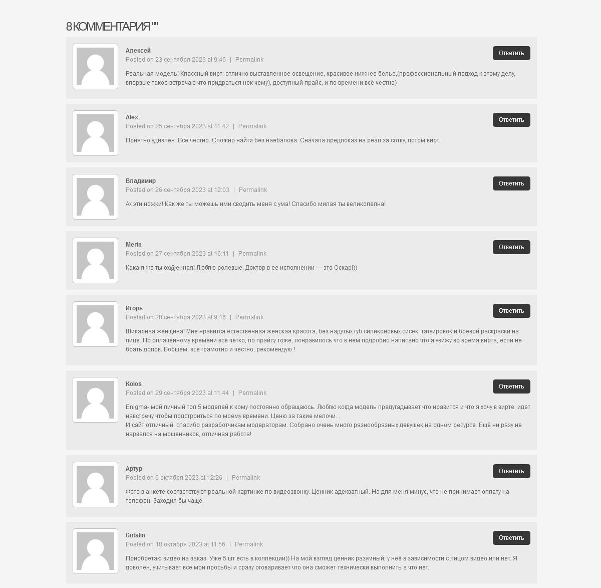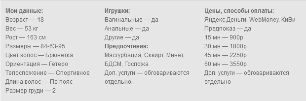 Мне нравится соблазнять мужчин, но оставаться для них недоступной. Поэтому вирт — отличный способ осуществить любые сексуальные фантазии. Уже не один год в индустрии виртуального удовольствия, поэтому смогу помочь как «новичку» разобраться в своих желаниях и фантазиях, так и искушенному гостю получить эмоции от встречи со мной. Очень ценю свое и ваше время. Поэтому я люблю конкретику. Чем больше вводных, пожеланий и ньюансов в ваших запросах и фантазиях, тем ярче эмоции от увиденного вы получите и мы не потеряем оплаченное время в процессе виртуальной встречи. Формат общения — видеозвонок или переписка с фото. А также фото и видео из архива и на заказ. Оплата по номеру карты или Юмани. Отвечаю на сообщения с 9.00 до 23ч по МСК времени. На бесцеремонные звонки без согласования и оплаты не отвечаю, и сразу блокирую таких пользователей. Никто не хочет быть прерван во время вирта во время оргазма, прошу взаимоуважения. В реальности не встречаюсь, только виртуальное общение.