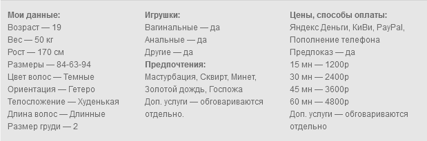 Привет мальчики, меня зовут Eva. Я очень красивая и молодая женщина. Как ты знаешь Адам и Ева были очень дружны, надеюсь мы с тобой подружимся еще лучше. Ведь я очень хрупкая и скромная модель, при этом пластична и умею очень многое. Я возбуждаюсь только от мысли про вирт по вебкамере, а когда вижу член собеседника просто тику. Игрушки, так же есть для всех моих сладких проникновений. Много сексуального белья и нарядов. Горячее молодое тело так и просится сказать, возьми меня скорее. Больше нравится ласкать себя вибратором и говорить пошлые словечки. У меня есть возможность просмотра по вебке как меня трахает парень. Экстремальные утехи на улице или в общественном месте так же допустимы, обговорим подробности в личке. Приглашаю в свой мир похоти и страсти, жду в гости ко мне не за скромностью.