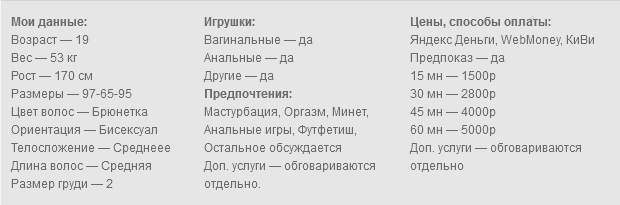 Я тут новенькая, данной деятельностью занимаюсь относительно недавно, поэтому вот небольшая информация обо мне. Мне 19 лет, можно сказать скоро будет 20. Внешность у меня азиатская, поэтому если захочешь я буду твоей тяночкой. Стройного телосложения, мой рост 170, 53кг. Худенькие ножки, красивая грудь 2,5 размера. Сисечки у меня свои, хвалят их все мои подружки. Многие говорят, что мне очень пойдет пирсинг сосков, но я немного побаиваюсь, поэтому пока эта идея в стопе. У меня есть пирсинг брови и ушей, также есть тату на шее. Со мной не нужно стесняться своих желаний. Я люблю показывать себя и не стесняюсь громко кончать по видеозвонку. Помимо этого мы можем пообщаться с тобой по смс, когда-нибудь кончал от секса по телефону? Или же я сниму для тебя фото/видео. Ну и конечно у меня уже есть своя мини коллекция порно. Обожаю С
