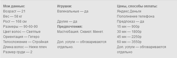 Готова исполнить твои самые сокровенные желания по скайпу. Делаю фото и видео. Обожаю играть в разные игры. Могу быть податливой или стать твоей госпожой. Сделаю всё, чтобы ты кончил. Работаю с лицом, есть качественная камера и профессиональное освещение.