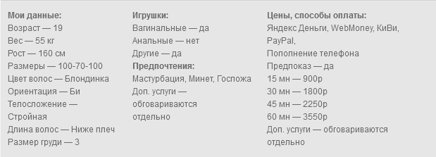Хочешь острых ощущений? Я восхитительная стройная блондинка со вторым размером груди, от которой никто не уходит неудовлетворенным. Моя аппетитная попочка и сочная грудь сведут тебя с ума. Видеозвонки через вебкамеру 4К 60 кадров BRIO. С профессиональным освещением. В моем арсенале есть вирт, фото и видео на заказ/готовые. Большой выбор нарядов и белья.