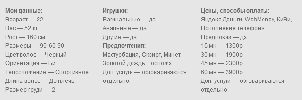 Привет милый, я разместила свою анкету тут что бы иметь возможность воплотить в реальность все твои фантазии. Мои упругие формы не оставят тебя равнодушным и ты не сможешь пройти мимо и не написать мне. Моя идеальная фигура и длинные ножки просто созданы что бы доставить тебе удовольствие ведь ты попросту не сможешь устоять перед ними. А мои глубокие глаза и милое личико тебе обязательно понравятся и захочешь общаться со мной как можно дольше. Когда я нахожусь перед камерой, я превращаюсь в настоящую пантеру, способную привести тебя в экстаз. Жду тебя в любое время что бы доставить тебе незабываемое удовольствие от виртуального секса по вебкамере, обещаю стараться всеми силами что бы доставить тебе удовольствие от нашей виртуальной встречи.