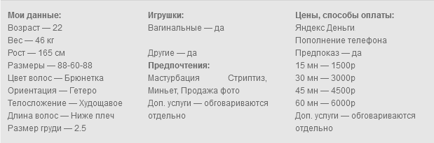 Как вы уже, наверно, заметили, рассматривая мои интим-фото в анкете, я очень миниатюрная молоденькая брюнеточка, которая занимается виртом по скайпу. На веб-камеру сделаю для вас практически все,что захотите,конечно,по предварительной договоренности. Для этого есть большой выбор самых разных секс-игрушек и костюмов. Вы сможете управлять нашими играми в реальном времени,а я постараюсь исполнить все желания под вашим чутким руководством. Полностью лицо не показываю, надеюсь и сами понимаете,по каким причинам. Так же, не встречаюсь с клиентами в реале. Однако,сделаю по скайпу все, что-бы воплотить в реальность даже самые сокровенные фантазии.