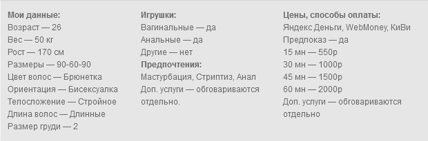 Могу предложить вам: сладчайшая попка, футфетиш, ролевые игры и т.д.