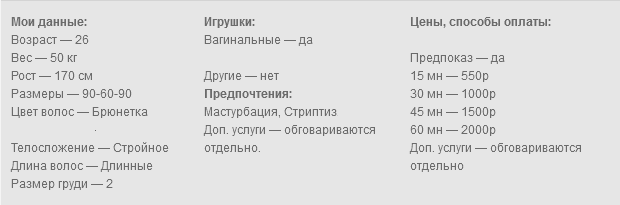 Готова исполнить твои самые сокровенные желания по скайпу. Делаю фото и видео. Обожаю играть в разные игры. Могу быть податливой или стать твоей госпожой. Сделаю всё, чтобы ты кончил. Работаю с лицом, есть качественная камера и профессиональное освещение.