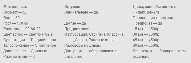 Привет. Я Sofa, у меня шикарная грудь третьего размера и упругая попка которая сведёт тебя с ума. Есть множество игрушек для наших с тобой шалостей, разные предметы, много белья. Заведу тебя и доведу до оргазма. В моем приватном шоу можешь получить кайф который ты ищешь. В сети я часто, напишешь и мы обсудим что ты любишь и хочешь во время приватного шоу. Обожаю извращения и доминацию в сексе. Для тебя я танцую стриптиз, ласкаю киску пальчиками, делаю горловой минет игрушке, пускаю слюнки, трахаю игрушкой киску, оргазм, сквирт, стоны, золотой дождик. Исполню самое заветное желание. Общение в скайпе, интим переписка к переписке прилагаются фото, видео, голосовые. Так же делаю фото и видео на заказ.