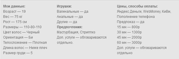 Приветик сладкий, я молоденькая пышка с 4 размером груди. Люблю ласкать свою киску, чтобы кто то наблюдал. У меня ты найдешь видео, фото, переписку на любую тему, а так же виртик онлайн. Онлайн возможно куча услуг: золотой дождь, анал, ролевые, множество других интересных допов и игрушек.