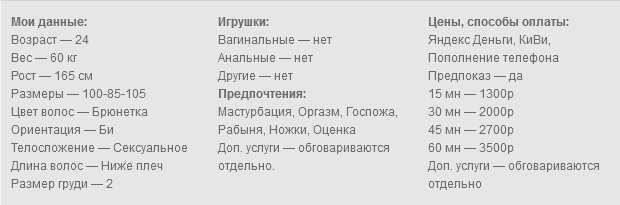 Привет, сладкий, для тебя я готова быть кем тебе угодно. Молодая, миленькая девочка, ждёт когда ты ей напишешь. С огромным удовольствием выслушаю все твои фантазии и идеи, и постараюсь воплотить их в жизнь, чтобы ты ушёл довольным и вернулся снова. Хочешь, буду твоей самой жёсткой госпожой, а хочешь, буду самой покорной рабыней. Кончу только для тебя и с удовольствием посмотрю, как кончаешь ты. Опишу, какой у тебя прекрасный член и покажу, как я от него возбуждаюсь. Со мной ты можешь фантазировать на любые темы и разговаривать о чём угодно, я поддержу разговор. Готова обсудить и рассмотреть фетиши и твои предпочтения. Обожаю секс, кончать и смотреть как ты кончаешь, заходи и ты не пожалеешь. Работаю без лица.