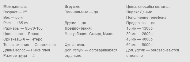 Готова исполнить твои самые сокровенные желания по скайпу. Делаю фото и видео. Обожаю играть в разные игры. Могу быть податливой или стать твоей госпожой. Сделаю всё, чтобы ты кончил. Работаю с лицом, есть качественная камера и профессиональное освещение.