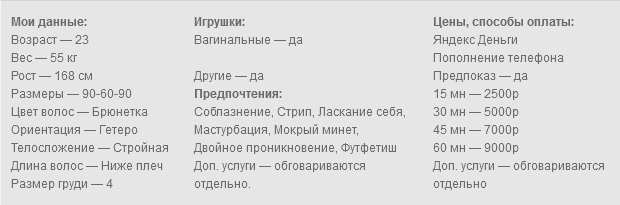 Готова исполнить твои самые сокровенные желания по скайпу. Делаю фото и видео. Обожаю играть в разные игры. Могу быть податливой или стать твоей госпожой. Сделаю всё, чтобы ты кончил. Работаю с лицом, есть качественная камера и профессиональное освещение.