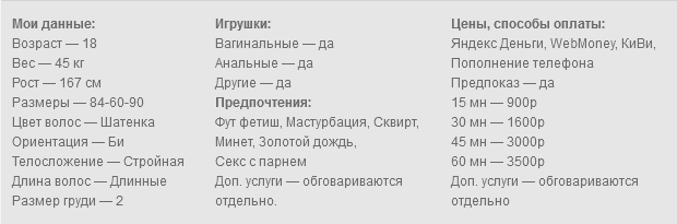 Готова исполнить твои самые сокровенные желания по скайпу. Делаю фото и видео. Обожаю играть в разные игры. Могу быть податливой или стать твоей госпожой. Сделаю всё, чтобы ты кончил. Работаю с лицом, есть качественная камера и профессиональное освещение.