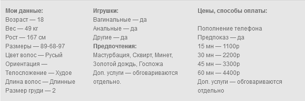 Хочу с тобой познакомиться и испытыть все чудо утехи в вирте. Интересно какой же ты на вкус? Мм очень любыпытно посмотреть на него без штанов. Моя дырочка очень узкая такую ты еще не видел. А попка само наслаждение, входит и выходит очень медленно и так просто туда не всунешь игрушечку. Любишь госпажу? я очень люблю командывать и подчинять своей воле. Фут-фетиши обажаю и очень их люблю, приходи ко мне для удовлетворения.