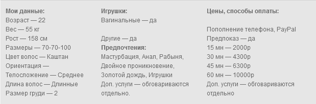 Привет, сладкий. Я твоя виртуальная девушка, которая онлайн почти 24/7. Приглашаю тебя на самый лучший звоночек. У меня почти нет табу и я выполняю любые желания. Я могу показать тебе золотой дождик, анал, двойное проникновение, контент с парнем, что-то связанное с едой, со связыванием, бдсм. В моем репертуаре есть разные игрушки. Такие как: двойной дилдо, дилдо с имитацией спермы, огромный и толстый дилдо, вибратор и анальная пробочка. Так же разные костюмы: монашка, училка и многие другие костюмчики. Я могу провести звонок за пределами квартиры,