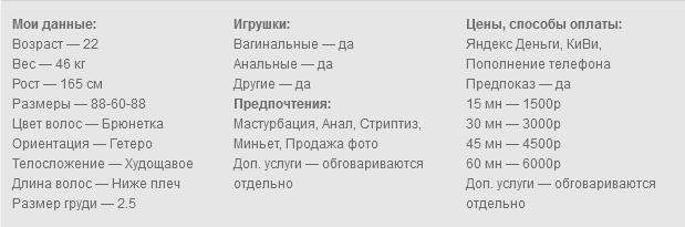 Как вы уже, наверно, заметили, рассматривая мои интим-фото в анкете, я очень миниатюрная молоденькая брюнеточка, которая занимается виртом по скайпу. На веб-камеру сделаю для вас практически все,что захотите,конечно,по предварительной договоренности. Для этого есть большой выбор самых разных секс-игрушек и костюмов. Вы сможете управлять нашими играми в реальном времени,а я постараюсь исполнить все желания под вашим чутким руководством. Полностью лицо не показываю, надеюсь и сами понимаете,по каким причинам. Так же, не встречаюсь с клиентами в реале. Однако,сделаю по скайпу все, что-бы воплотить в реальность даже самые сокровенные фантазии.