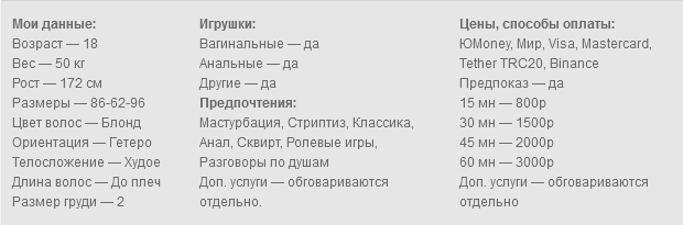 Мое имя Полина. Я очень рада встречи с тобой, ты нашел самую страстную и развязную блондинку, которая любит брать в ротик. Очень люблю играть с собой пальчиками и доставлять себе удовольствие. Я немного стесняюсь, когда за мной подглядывают, но меня это всегда так возбуждает. Я так же люблю игрушки, они приносят мне незабываемое удовольствие, но я буду рада, если ты разделишь его со мной, милый. У меня узкая киска и думаю, твой член идеально в ней поместится. Пиши мне скорее, я почти все время онлайн и хочу поиграть с тобой. Очень хочу доставить нам обоим удовольствие и оставить приятные воспоминания.
