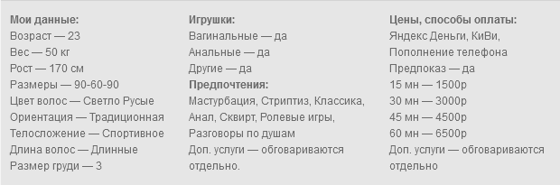 Привет. Я Sofa, у меня шикарная грудь третьего размера и упругая попка которая сведёт тебя с ума. Есть множество игрушек для наших с тобой шалостей, разные предметы, много белья. Заведу тебя и доведу до оргазма. В моем приватном шоу можешь получить кайф который ты ищешь. В сети я часто, напишешь и мы обсудим что ты любишь и хочешь во время приватного шоу. Обожаю извращения и доминацию в сексе. Для тебя я танцую стриптиз, ласкаю киску пальчиками, делаю горловой минет игрушке, пускаю слюнки, трахаю игрушкой киску, анал, двойное проникновение, оргазм, сквирт, стоны, золотой дождик. Исполню самое заветное желание. Общение в скайпе, интим переписка к переписке прилагаются фото, видео, голосовые. Так же делаю фото и видео на заказ.
