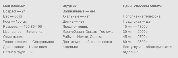 Привет, сладкий, для тебя я готова быть кем тебе угодно. Молодая, миленькая девочка, ждёт когда ты ей напишешь. С огромным удовольствием выслушаю все твои фантазии и идеи, и постараюсь воплотить их в жизнь, чтобы ты ушёл довольным и вернулся снова. Хочешь, буду твоей самой жёсткой госпожой, а хочешь, буду самой покорной рабыней. Кончу только для тебя и с удовольствием посмотрю, как кончаешь ты. Опишу, какой у тебя прекрасный член и покажу, как я от него возбуждаюсь. Со мной ты можешь фантазировать на любые темы и разговаривать о чём угодно, я поддержу разговор. Готова обсудить и рассмотреть фетиши и твои предпочтения. Обожаю секс, кончать и смотреть как ты кончаешь, заходи и ты не пожалеешь. Работаю без лица.