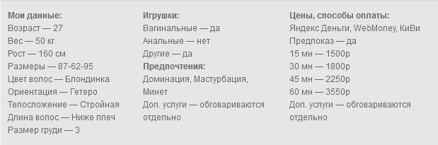 Я уверена ты меня точно где то видел. Привет, буду рада видеть тебя в своей приятной компании. Здесь тебя ждёт: приятная атмосфера, хорошее качество изображения, белье/туфли/чулки/наряды/одежда, игрушки (разной толщины, длинны, цвета, вибрации и тд., минетик и даже глубокий со слюнками, люблю кончать от игрушки с подогревом и доводить до оргазма тебя сладкими стонами, разговорами, доминацией. Нравится футфетиш, масло, ловенсы, а если любишь переписку то она тоже у меня есть. В Наличии фото, видео под заказ и готовые. Есть некоторые табу: анал, унижения, зд. В общем жду тебя у себя, пиши.